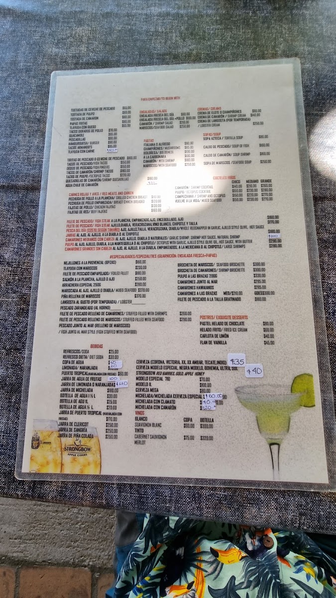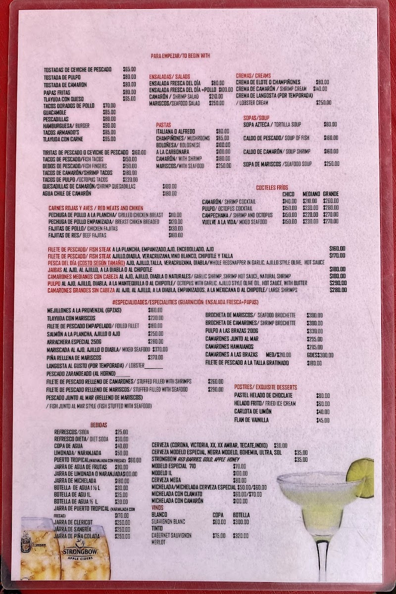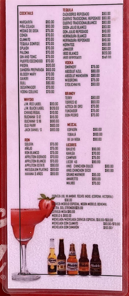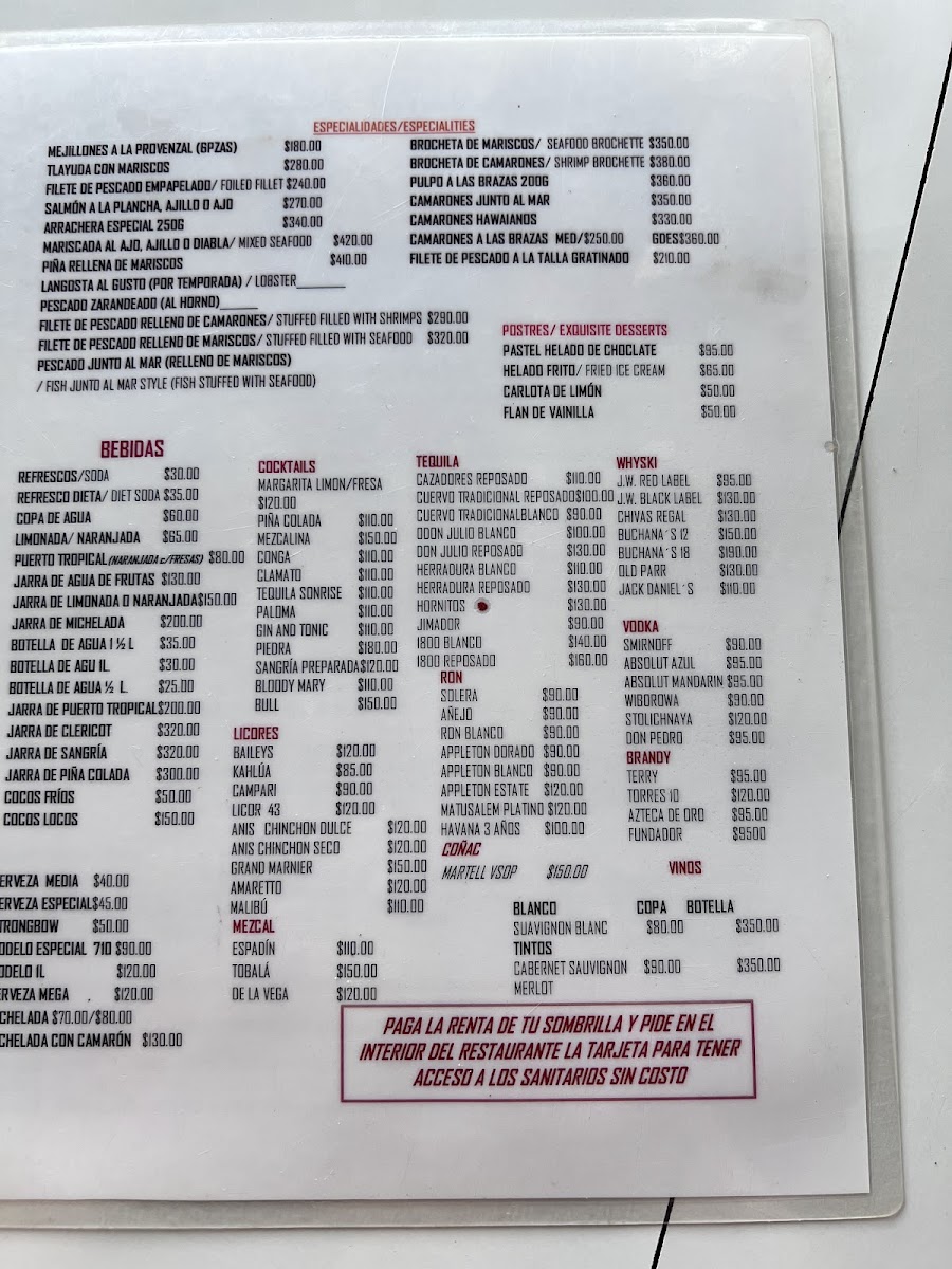 The menu offers a variety of seafood-focused dishes reflecting the coastal location, alongside beverages suitable for casual dining and light meals. It includes appetizers such as shrimp cocktail and ceviche tostadas, seafood mains like mojarras, fish fillets, and grilled octopus, as well as traditional regional specialties including tlayudas with assorted seafood. There are also options of brochetas and dishes prepared with shrimp, lobster cream, and salmon.